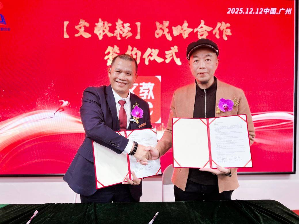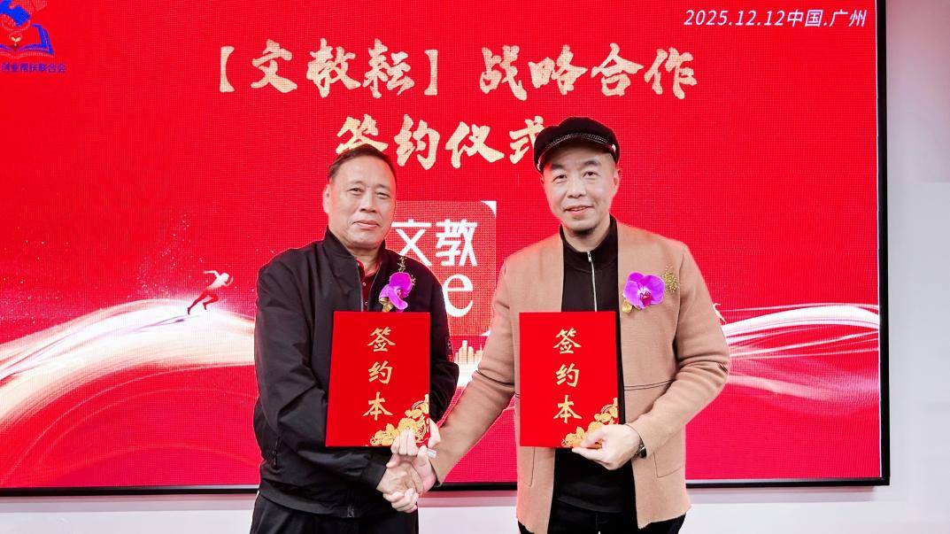 广东省社会政策研究会创业帮扶管理委员会主任张启新与 广东省世家云吉(文教耘)管理中心董事长温翼帆签约